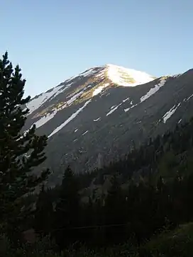 Quandary Peak is the highest summit of the Tenmile Range in the Rocky Mountains of North America and is the most commonly climbed fourteener in Colorado.[6] It has nearly the same elevation as Castle Peak and Mount Blue Sky. It lies in Summit County and within the White River National Forest about 6 miles (10 km) south-southwest of the town of Breckenridge.