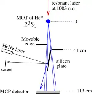 In the case with He, the additional resonant laser could be used to release the atoms and provide them an additional velocity; the delay since the release of the atoms till the registration allowed to estimate this additional velocity; roughly, , where is time delay since the release of atoms till the click at the detector. Practically, could vary from 20 to 130 m/s (45 to 291 mph; 72 to 468 km/h).[8][9][10]