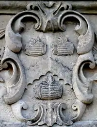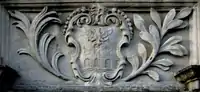 | Granville: Gules, three clarions or. For George Granville, 1st Baron Lansdowne of Bideford (1666-1735), nephew of John Granville, 1st Earl of Bath (1628–1701) and heir male of William Henry Granville, 3rd Earl of Bath (1692-1711).[45] It is the only escutcheon with heraldic supporters, generally reserved for use by nobility, here Two winged griffins rampant or. Above the escutcheon is a baron's coronet. He is identifiable by the style of his coronet and by his motto, shown inscribed on a scroll below: Deo, Patriae, Amicis[46] ("For God, my Country and Friends"), the motto of his uncle John Granville, 1st Earl of Bath having been: Futurum invisibile ("The future is unseen").[47] The arms are not those of John Granville, 1st Earl of Bath (1628–1701), or of his son Charles Granville, 2nd Earl of Bath (1661–1701). The latter's son William Granville, 3rd Earl of Bath (1692-1711) died aged only 19 two years before the building was completed in 1713. | ||||