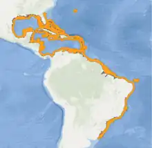 Queen angelfish are found in tropical and subtropical areas of the Western Atlantic Ocean around the coasts and islands of the Americas. They occur from Florida along the Gulf of Mexico and the Caribbean Sea down to Brazil. Their range extends as far east as Bermuda and the Saint Peter and Saint Paul Archipelago.[1][6] Queen angelfish are benthic or bottom-dwelling and occur from shallow waters close to shore down to 70 m (230 ft). They live in coral reefs, preferring soft corals, and swim either alone or in pairs.[6]
