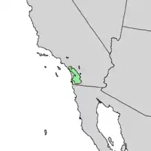 The Engelmann oak ranges from the foothills of the San Gabriel Mountains in eastern Los Angeles County through the Santa Ana Mountains of Orange County and the western foothills and mesas of the Peninsular Ranges in Riverside and San Diego counties, extending into the Sierra Juárez and Sierra de San Pedro Mártir ranges of northern Baja California. It is generally found in savannas and woodlands above the dry coastal plain, but below the 1,300 m (4,300 ft) elevation where colder winters prevail. The Engelmann oak has a smaller range than most California oaks, and suburban sprawl in the San Gabriel Valley has eliminated the oaks from most of the northern part of the range. The largest remaining stands of Engelmann oaks are on the Santa Rosa Plateau, near Murrieta in Riverside County, and on Black Mountain near Ramona in San Diego County.[2]