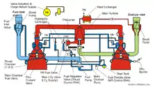 The combustion chambers of the RD-180 share a single turbopump unit, much like in its predecessor, the four-chambered RD-170. The RD-180 is fueled by an RP-1/LOX mixture and uses an extremely efficient, high-pressure staged combustion cycle. The engine runs with an oxidizer-to-fuel ratio of 2.72 and employs an oxygen-rich preburner, unlike typical fuel-rich US designs. The thermodynamics of the cycle allow an oxygen-rich preburner to give a greater power-to-weight ratio, but with the drawback that high-pressure, high-temperature gaseous oxygen must be transported throughout the engine. The movements of the engine nozzles are controlled by four hydraulic actuators. The engine can be throttled from 47% to 100% of nominal thrust.[3]