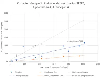 Graph showing the evolutionary rate of REEP5 in comparison to Cytochrome C and Fibrinogen Alpha