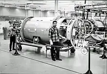 The Agena was 5.0 feet (1.5 m) in diameter, three-axis stabilized (for the benefit of the reconnaissance system cameras) and its Bell Aircraft XLR81 engine produced 16,000 lbs (71 kN) of thrust using unsymmetrical dimethylhydrazine (UDMH) as the fuel, and inhibited red fuming nitric acid (IRFNA) as the oxidizer.[6] This is a hypergolic fuel/oxidizer combination, and as such, it does not need an ignition system. This rocket engine could be restarted multiple times in orbit, by radio command, and it frequently was. The engine was notable for its unusual aluminum construction. The regeneratively-cooled channels that cooled the throat and nozzle were formed from straight gun drill formed channels. The parabolic shape of the chamber throat made for a difficult gun-drilling problem, which Bell Aerosystems engineers solved by arranging the cooling channels in a "One-Sheeted Circular Hyperboloid" shape, allowing machinists to gun-drill straight cooling channels through the curved surfaces of the combustion chamber. The engine was derived from the XLR-81 propulsion unit for the canceled rocket-propelled nuclear warhead pod of the Convair B-58 Hustler bomber. Until 1959, the Agena was also known as the Discoverer Vehicle or Bell Hustler.[3]