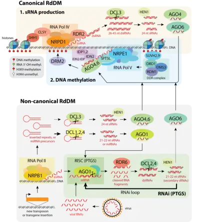 - 1 2 3 4 Wendte JM, Pikaard CS (January 2017). "The RNAs of RNA-directed DNA methylation". Biochimica et Biophysica Acta (BBA) - Gene Regulatory Mechanisms. 1860 (1): 140–148. doi:10.1016/j.bbagrm.2016.08.004. PMC 5203809. PMID 27521981.