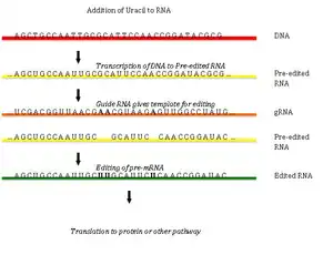 - ↑ Kable ML, Heidmann S, Stuart KD (May 1997). "RNA editing: getting U into RNA". Trends in Biochemical Sciences. 22 (5): 162–166. doi:10.1016/S0968-0004(97)01041-4. PMID 9175474.