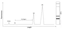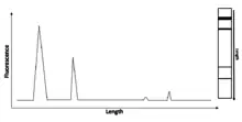 Electrophoresis is the process of separating nucleic acid species based on their length by applying an electric field to them. As nucleic acids are negatively charged, they are pushed by an electric field through a matrix, usually an agarose gel, with the smaller molecules being pushed farther, faster.[3] Capillary electrophoresis is a technique whereby small amounts of a nucleic acid sample can be run on a gel in a very thin tube. There is a detector in the machine that can tell when nucleic acid samples pass through a specific point in the tube, with smaller samples passing through first. This can produce an electropherogram such as the one in Figure 1, where length is related to time at which the samples pass the detector.