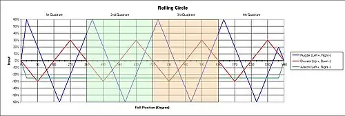 Below is a graph that illustrates the elevator and rudder input as a function of rolling position during one turn quadrant. For this case, 60° rudder phase lead and 90° elevator phase lead are used. Actual amplitude and phase leads may vary depending on aircraft behavior.
