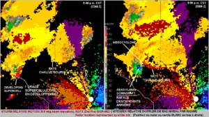 In the case of birds, storms may overcome a flock in flight, especially in times of migration. The Doppler image to the right shows an example wherein a group of bats is overtaken by a thunderstorm.[15] In the image, the bats are in the red zone, which corresponds to winds moving away from the radar station, and enter into a mesocyclone associated with a tornado (in green). These events may occur easily with birds, which can get killed in flight, or stunned and then fall (unlike flightless creatures, which first have to be lifted into the air by an outside force). Sometimes this happens in large groups, for instance, the blackbirds falling from the sky in Beebe, Arkansas, United States on December 31, 2010.[16] It is common for birds to become disoriented (for example, because of bad weather or fireworks) and collide with objects such as trees or buildings, killing them or stunning them into falling to their death. The number of blackbirds killed in Beebe is not spectacular considering the size of their congregations, which can be in the millions.[17] The event in Beebe, however, captured the imagination and led to more reports in the media of birds falling from the sky across the globe, such as in Sweden and Italy,[18] though many scientists claim such mass deaths are common occurrences but usually go unnoticed.[19] In contrast, it is harder to find a plausible explanation for rains of terrestrial animals.