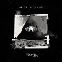 Jerry Cantrell took the title "Rainier Fog" from the Mount Rainier, a volcano that overlooks the Seattle metropolitan area.[9] The cover art was revealed on June 27, 2018, and it features a black and white image of a triangle floating on the sea surrounded by fog.[38] The triangle has an eye in the middle, similar to the Eye of Providence (or the all-seeing eye of God). The digipak packaging has a die-cut eye. A person of unknown gender with short blond hair can be seen from behind inside of the eye.[45] When the booklet is opened, it is revealed that the person inside of the eye is actually standing on a river and looking at the Mount Rainier, and the drawing of an eye has tears falling down straight into the river.[46] The artwork was designed by Ryan Clark,[47] who also designed the artwork for Alice in Chains' previous album, The Devil Put Dinosaurs Here (2013).[48] Photos of the band taken by Scott Dachroeden complete the booklet.[46]