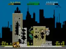 The player can climb any of the buildings, punching them to pieces and reducing them to rubble. Non-playable human characters within the levels can also be punched or grabbed and food items can be eaten. The player's monster receives damage from enemy bullets, sticks of dynamite, shells, punches from other monsters, and falls. Health is recovered by eating food items such as fruit, roast chicken, or soldiers. If a monster takes too much damage, it reverts into naked human form and starts walking off the screen sideways, covering its body with its hands. In this state, players can be eaten by another monster. If the player continues, the human mutates back into the monster or (if the human walked off the screen) flies in on a blimp (but has lost their score), with a full life bar.