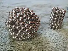 Two objects made of neodymium magnets. The right object has the close-packing of equal spheres.
