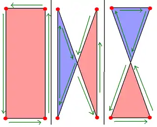 The interior of a crossed rectangle can have a polygon density of ±1 in each triangle, dependent upon the winding orientation as clockwise or counterclockwise.