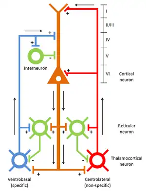 Thalamocortical networks consist of neurons in both the thalamus and cortex. The thalamic neurons are typically one of three types: thalamocortical, with axons extending into the cortex, reticular, and thalamic interneurons.[4] Thalamocortical neurons (TC) vary significantly in size, which is correlated with the depth to which they project into the cortex. These cells are limited in their outputs and seem to only connect to the cortical layers and reticular thalamic neurons. Reticular neurons (RE), on the other hand, are highly interconnected and have their own intrinsic oscillatory properties. These neurons are capable of inhibiting thalamocortical activity via their direct connections to TCs. Corticothalamic neurons are the cortical neurons that TC neurons synapse on. These cells are glutaminergic excitatory cells that exhibit increasing activity as they become more depolarized. This activity is described as "bursting", firing in the gamma range at rates between 20 and 50 Hz.