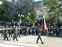 The band marching on Prince Alexander of Battenberg Square during the Bulgarian Armed Forces Day parade in 2009.