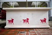 The goats were first covered with plastic sheeting, and then removed with paint thinner; the process involved replacing the sealer on the planters, and was estimated to cost $5,000.[3] Despite the original icons being covered, figures of the red goats were included in the parade which celebrated the completion of the plan.