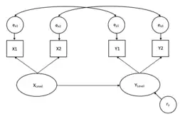 The dyadic score model uses two partners observed predictor and outcome variables to compute both dyadic 'level' and 'difference' latent variables.[80] The level variables are similar to the common fate latent variables while the difference variables represent the within-dyad contrast.[80] See Figure 6.
