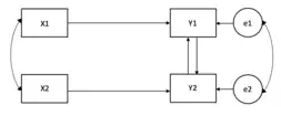 The mutual influence or dyadic feedback model is a method of considering reciprocal influence of partners' predictor(s) on one another's and partners' outcome on one another's.[79] Compared to the APIM, this model assumes there are no partner effects and no other types of non-independence, as seen in the predictor-predictor and outcome-outcome paths.[79] Additionally, it assumes equal effects of partner's influence on one another (i.e., 1 influences 2 equally as 2 influences 1).[79] See Figure 5.