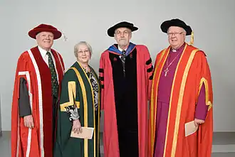 The Honorary Senior Fellowship is Renison University College's equivalent to honorary doctorates awarded by degree-granting universities. It is granted to persons who have distinguished themselves in the wider community through their contributions to one or more of the following: Renison, the University of Waterloo, the Anglican Church, the wider community of Kitchener-Waterloo, Ontario, Canada, or the world, and may have some affinity with the college. This honour may also be granted to persons who have served as volunteers for the college.[10]