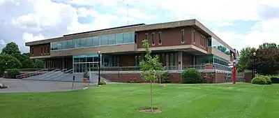 Another unique building is the Voorhees Computing Center (VCC). Originally the St. Joseph's Seminary chapel, it was built in 1933 and acquired by Rensselaer in 1958, and after renovation served as the institute's library from 1960 until the completion of the new Folsom Library, in 1976.[45] The Folsom Library, located adjacent to the computing center, has a concrete exterior that was designed to harmonize with the light gray brick of the chapel;[46] architecturally, it is an example of the modern brutalist style.[47] Subsequently, the university was unsure of what to do with the chapel, or whether to keep it at all, but in 1979 decided to preserve it and renovate it to house computer labs and facilities to support the institute's computing initiatives. Today the VCC serves as the backbone for the institute's data and telephony infrastructure.