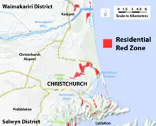 A residential red zone is any of several areas of land in and around Christchurch, New Zealand, that experienced severe damage in the 2010 and 2011 Christchurch earthquakes and were deemed infeasible to rebuild on. Through voluntary buyouts, the Crown acquired and demolished or removed over 8,000 properties.[1]: 5 The majority were located in a broad swath of the eastern suburbs along the Avon River / Ōtākaro that had suffered damage from soil liquefaction.