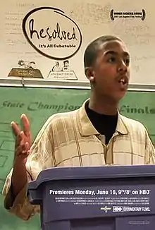 Resolved is a 2007 documentary film concerning the world of high school policy debate. The film was written and directed by Greg Whiteley of New York Doll fame.[1] The film captured the "Audience Award" title at its debut on June 23, 2007 at the Los Angeles Film Festival.[2] The film was produced by One Potato Productions.[1] The film made its television debut on HBO in the summer of 2008 and subsequently received two Emmy nominations: one nomination for Best Documentary; the other for Editing for the 2009 Emmy Awards held in September 2009. In July 2009, it was released on DVD by Image Entertainment.