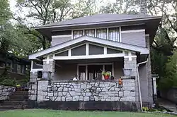 The Retan House is a historic house at 2510 South Broadway in Little Rock, Arkansas. It is a modest two-story frame structure, with shallow-pitch hip roof with broad eaves. A single-story porch extends across the front, with a broad gable roof supported by stone piers. The entrance is on the left side, and there is a three-part window at the center of the front under the porch. Above the porch are a band of four multi-pane windows in the Prairie School style. The house was built in 1915 to a design by Charles L. Thompson, and is one of his finer examples of the Prairie School style.[2]