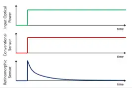 Top: Step change in light intensity incident on sensor as a function of time. Middle: Form of output from conventional optical sensor as a function of time. Bottom: Form of output from retinomorphic sensor as a function of time.