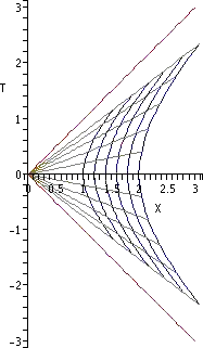 This defines a local Lorentz frame in the tangent space at each event (in the region covered by our Rindler chart, namely the Rindler wedge). The integral curves of the timelike unit vector field give a timelike congruence, consisting of the world lines of a family of observers called the Rindler observers. In the Rindler chart, these world lines appear as the vertical coordinate lines . Using the coordinate transformation above, we find that these correspond to hyperbolic arcs in the original Cartesian chart.