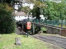 The island is a meadow lightly covered with trees with dense patches, shrubbery and reeds at each end. The former common land meadow is publicly open and Metropolitan Green Belt.[1] It is a long area of open riverside on the side of the river opposite the Thames Path — from here the point of Sunbury Lock Island can be seen. It is connected to the bank by an elegant arched footbridge with simple metal balustrades and separate painted round handrails and in dry periods four-wheel vehicle access is possible via a ford of the narrow backwater separating it from the land. Rivermead was originally two islands, the much smaller, downstream part being Swan's Rest, since the late 20th century completely joined, remaining part of Elmbridge as its fishing rights were anciently conferred to the parish south of the river.[2]