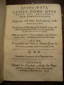 - ↑ 'Qvodlibets, lately come over from New Britaniola, old New-found-land. Epigrams and other small parcels, both morall and diuine. The first foure bookes being the authors owne: the rest translated out of that excellent epigrammatist, Mr. Iohn Owen, and other rare authors: With two epistles of that excellently wittie doctor, Francis Rablais: translated out of his French at large. All of them composed and done at Harbor-Grace in Britaniola, anciently called Newfound-Land.' (1628)