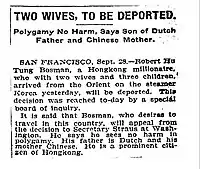 At age 15, Robert was informally engaged to the Eurasian daughter of Hector Coll Maclean of Jardines, Margaret Mak (aka Maclean, 麥秀英; 1865–1944). They married when he was 18, and she was 16.[22] Since she was unable to bear children, Robert adopted Ho Fook's first son, Ho Wing, following Chinese tradition, and took Chau Yee-man (周綺文) as a concubine in 1891.[23] Still childless after three years (Chau Yee-man later gave birth to Mary Hotung 何純姿[24]), Margaret persuaded her maternal cousin Clara Cheung Lin-kok (張靜容 a.k.a. 張蓮覺;[13] 1875–1938),[23] to accept his hand as a "co-equal" wife; they married in 1895.[25] Clara Ho Tung later gave birth to three sons and seven daughters.