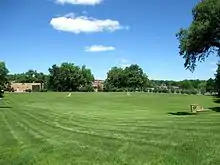 The Commons has since become associated with the Kent State shootings and forms a large part of the May 4, 1970, Kent State Shootings Site, which was listed on the National Register of Historic Places in 2010 and made a National Historic Landmark in 2017.[13] On the southern edge of the Commons is the Victory Bell, which was placed there in 1950 after being donated by a local railroad. While it was originally rung following KSU football victories, it became associated first with the antiwar movement of the 1960s and ultimately with the events surrounding the Kent State shootings as it was rung to announce the start of demonstrations. It is still rung every May 4 at 12:24pm, the moment of the shootings, to honor those who were killed or injured. The Commons was the site of several protests in the 1960s and into 1970, including those just prior to the shootings on May 4, with the ROTC building burned down by arsonists on May 2, 1970. The Commons continues to be used for general recreation, and is also the site or the annual commemoration of the Kent State shootings.[14]