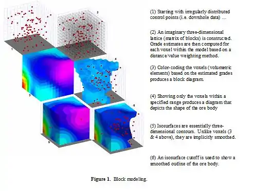 Block modeling (Figure 1) is simply the three-dimensional version of gridding. The original data points typically consist of quantitative downhole data (e.g. geochemistry, ore grades, physical properties, etc.).