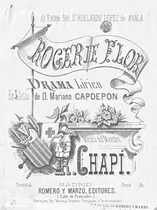 Roger de Flor is an opera (drama lírico) in three acts by Ruperto Chapí for libretto by Mariano Capdepón. It is the third of the three operas composed by Chapí during his studies in Paris and Italy. It was staged for the first time at the Teatro Real in Madrid on 23 January 1878.[1][2] The first modern performance was on 10 March 2012 in Palau de la Música de València in a concert performance.