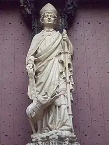 Saint Romanus of Rouen (French: Romain; reconstructed Frankish: *Hruomann; died c. 640 AD) was a scribe, clerical sage, and bishop of Rouen. He would have lived under Dagobert I (629–39), though his date of birth is unknown. His life is known in legend and tradition[1] and is shown in the stained glass windows (c. 1521) and south gate of Rouen Cathedral and the stained glass windows of the église Saint-Godard (1555). The Catholic Encyclopedia claims that his legend has little historical value[2] with little authentic information.[3] He was both Lord Chancellor of France and Référendaire of France. (For Saint Romanus, Martyr, please see Romanus of Caesarea).