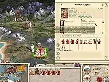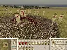 The game's main campaign takes place from 270 BC to 14 AD, showcasing the rise and final centuries of the Republican period and the early decades of the imperial period of Ancient Rome.[7] Gameplay is split between real-time tactical battles and a turn-based strategic campaign.[6] Within the campaign, players manage the economy, government, diplomacy, and military of their faction and attempt to accomplish a series of objectives on a map that encompasses most of Europe, North Africa, and the Near East.[8] On the battlefield, the player controls groups of soldiers and uses them to engage in combat with enemy forces.