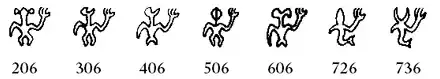 Some of the more iconic rongorongo glyphs. The seated man [bottom left] is thought to be a compound. Readings from Barthel (1958). The captions in the right-most column are merely descriptive.