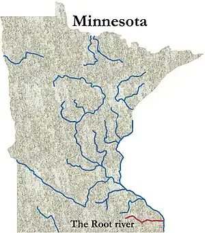 The Root River is formed by the merger of its North Branch Root River and Middle Fork Root River in Chatfield, Minnesota. A mile and a half north of Lanesboro, Minnesota it is joined by the South Branch Root River.[2][3][4][5] The South Fork Root River joins the Root River near Houston, Minnesota.[6][7]