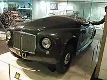 In March 1950, Rover showed the JET1 prototype, the first car powered with a gas turbine engine, to the public.[21] JET1, an open two-seat tourer, had the engine positioned behind the seats, air intake grilles on either side of the car,[22] and exhaust outlets on the top of the tail.[23] During tests, the car reached a top speed of 88 mph (142 km/h). After being shown in the United Kingdom and the United States in 1950,[24] JET1 was further developed,[25] and was subjected to speed trials on the Jabbeke highway in Belgium in June 1952,[26] where it exceeded 150 miles per hour (240 km/h).[27] JET1 is currently on display at the London Science Museum.