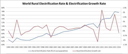 This graph shows the world rural electrification rate along with the electrification growth rate 1990–2016 and synthesizes data from the World Bank[28]