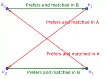 Similarly, since matching B is stable, d2 prefers its hospital in B over h1; denote this hospital by h3, and denote the prefererence by a green arrow from d2 to h3.