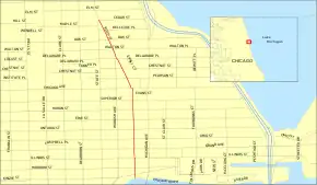 Rush Street is a one-way street in the Near North Side community area of Chicago in Cook County, Illinois, United States. The street, which starts at the Chicago River between Wabash and North Michigan Avenues, runs directly north until it slants on a diagonal as it crosses Chicago Avenue then it continues to Cedar and State Streets, making it slightly less than a mile long.[1] One lane also runs southbound from Ohio Street (600N) to Kinzie Street (400N) as part of a two-way street segment. It runs parallel to and one block west of the Magnificent Mile on the two-way traffic North Michigan Avenue, which runs at 100 east up to 950 north.[2] The street, which is also one block east of the one-way southbound Wabash Avenue, formerly ran slightly further south to the Chicago River where over time various bridges connected it to the Loop, Chicago's central business district.