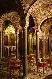 The apse has remains of 9th century mosaics depicting the Redeemer with Saints Paul, Cecilia, Paschal I, Peter, Valerian, and Agatha.