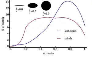 The percentage of galaxies with a particular axis ratio (minor/major) for a sample of lenticular and spiral galaxies. The inset is a visual representation of the profile of either at the specified minor (b) to major (a) axis ratios.[4]
