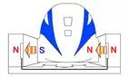 As the train accelerates, the magnetic fields of its superconducting magnets induce a current into these coils due to the magnetic field induction effect. If the train were centered with the coils, the electrical potential would be balanced and no currents would be induced. However, as the train runs on rubber wheels at relatively low speeds, the magnetic fields are positioned below the center of the coils, causing the electrical potential to no longer be balanced. This creates a reactive magnetic field opposing the superconducting magnet's pole (in accordance with Lenz's law), and a pole above that attracts it. Once the train reaches 150 km/h (93 mph), there is sufficient current flowing to lift the train 100 mm (4 in) above the guideway.[3]