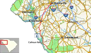 SC 81 heads to the north and enters Iva. At Hamilton Street, it intersects SC 184 which begins a concurrency through town. They intersect the western terminus of SC 413. Here SC 184 and SC 413 travel to the southeast on East Green Street. SC 81 leaves town and curves to the northwest. The highway begins curving to the north-northeast and passes Crescent High School. It heads to the north-northwest and enters Starr. There, it intersects the eastern terminus of SC 412 (Stones Throw Avenue). Then, it travels to the north-northeast and back to the north-northwest before it enters Homeland Park. The highway curves again to the north-northeast and passes Homeland Park Elementary School. Then, it intersects U.S. Route 29 (US 29; West Shockley Ferry Road). The two highways begin a short concurrency. One block later, they intersect SC 28 (Pearman Dairy Road). One block after that, US 29 splits off to the northeast. SC 81 heads in a fairly northerly direction and passes Orr Mill Park just before entering Anderson. At Sayre Street, US 29 Business (US 29 Bus.) comes from the west and begins traveling concurrent with SC 81. At the same intersection, SC 28 Bus. comes from the east and joins them. The three highway travel to the north and intersect US 76/US 178, which also joins the concurrency. The five-highway concurrency intersects the eastern terminus of SC 24 (Whitner Street). At Greenville Street, US 29 Bus./SC 28 Bus./SC 81 turns to the right for one block, where SC 28 Bus. turns left onto Main Street. US 29 Bus. and SC 81 pass AnMed Health Medical Center and then split at a point west of Anderson University. SC 81 heads northeast and passes Cater Lake Park. It then crosses over Cox Creek and then passes McCants Middle School. It leaves Anderson and passes Oaklawn Cemetery. The highway then passes T. L. Hanna High School. Then, it has an interchange with Interstate 85 (I-85). It turns left onto SC 8 (Easley Highway). The two highways travel concurrently to the north-northwest. When they split, SC 81 resumes its northeasterly direction. It passes by Wren Elementary School, Wren Middle School, and Wren High School. The highway intersects SC 86. It has a short easterly segment before curving back to the northeast. It crosses over Big Brushy Creek and enters Powdersville. It passes Pleasant View Cemetery and passes Concrete Primary School. Immediately after crossing over Craven Creek, it intersects SC 153. The highway passes Dolly Cooper Park. When, it crosses over the Saluda River, not only does it leave Powdersville, it enters Greenville County.[5][6][7]