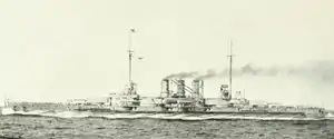 SMS Thüringen[lower-alpha 1] was the third vessel of the Helgoland class of dreadnought battleships of the German Kaiserliche Marine (Imperial Navy}. Thüringen's keel was laid in November 1908 at the AG Weser dockyard in Bremen. She was launched on 27 November 1909 and commissioned into the fleet on 1 July 1911. The ship was equipped with twelve 30.5 cm (12 in) guns in six twin turrets, and had a top speed of 21 knots (39 km/h; 24 mph). Thüringen was assigned to I Battle Squadron of the High Seas Fleet for the majority of her career, including World War I.