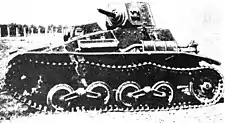 An experimental model was completed in 1934. The TK was a small light tracked vehicle with a turret armed with one machine gun. For cargo transportation it pulled an ammunition trailer.[63] After trials in both Manchukuo and Japan, the design was standardized as the Type 94 tankette. It was reclassified as the Type 94 (Type 2594; tankette) and was designed for "reconnaissance", but could also be utilized for supporting infantry attacks and transporting supplies.[28][27] It entered service in 1935. The lightweight Type 94 was "tailored" for operating in China.[29] It was used for infantry support and reconnaissance by infantry divisions.[19] The Type 94 tankette proved effective in Manchuria and elsewhere as the Chinese National Revolutionary Army consisted of only three tank battalions to oppose them. As with nearly all nation's tankettes built in the 1920s and 1930s, they had thin armor and could often be penetrated by standard small arms fire.[64]