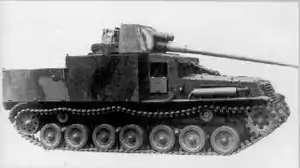 The Type 4 Chi-To was a thirty-ton, all-welded tank with a maximum armor thickness of about 75 mm. It was much larger than the Type 97 Chi-Ha, with a longer, wider, tall chassis, supported by seven road wheels on each side.[107][111] The 400 hp (300 kW) gasoline engine was significantly more powerful than the 180 kW (240 hp) engine of the Type 3 Chi-Nu, giving it a top speed of 45 km/h (28 mph). The tank had a range of 250 km (160 mi).[112] The main armament, a Type 5 75 mm tank gun, was based on the Type 4 75 mm AA Gun that was in turn essentially a copy of a Bofors Model 1929 75 mm AA Gun, housed in a large powered, well-armoured hexagonal gun turret. One Type 97 heavy tank machine gun was mounted in the front hull, and there was a ball mount on the side of the turret for a second one. Two Type 4 Chi-To tanks were completed prior to the end of the war. Neither of the completed tanks saw combat use.[107][113]